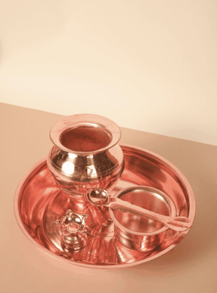 Copper Pooja Set of 5 | 1 Plate, 1 Kalash, 1 Fullpatra, 1 Pali, And 1 Niranjan | Pure Copper Set