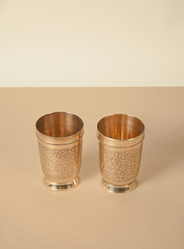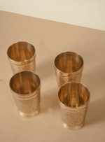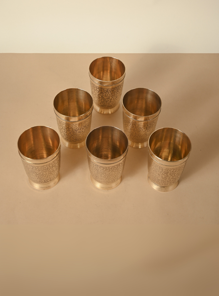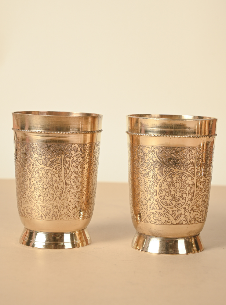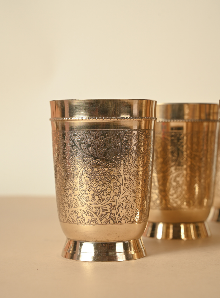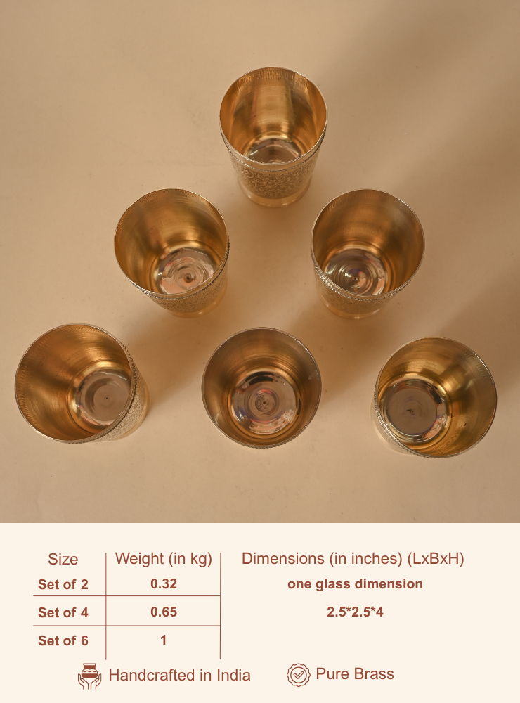 This set of handcrafted Brass Glasses features intricate hand-etched designs that add elegance and character to your tableware. Available in sets of 2, 4, or 6 and multiple sizes, each glass is made with premium quality brass, perfect for daily use or special gatherings.
