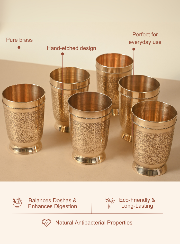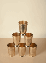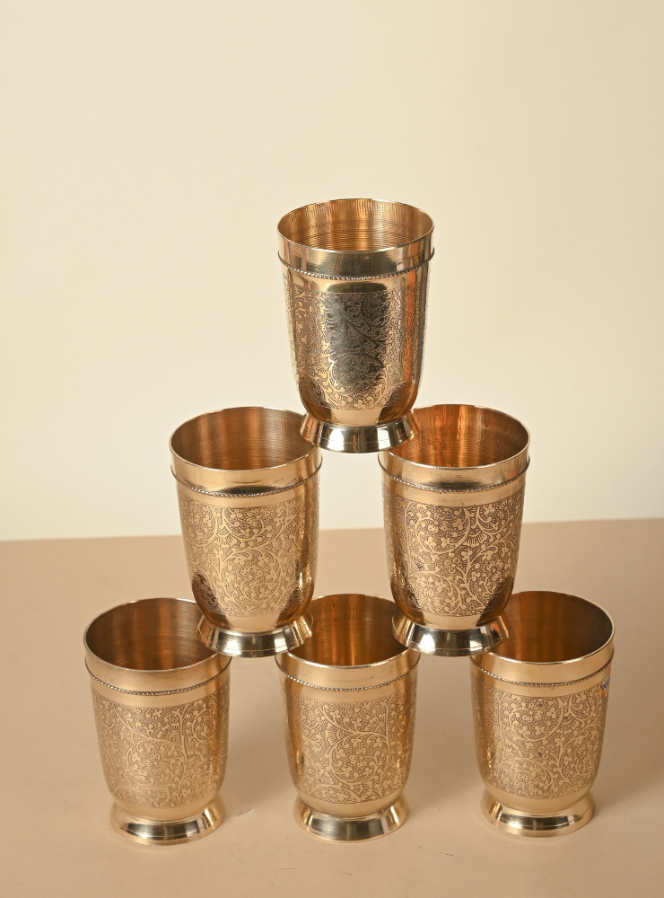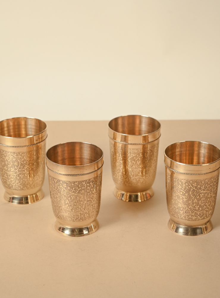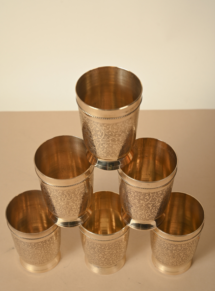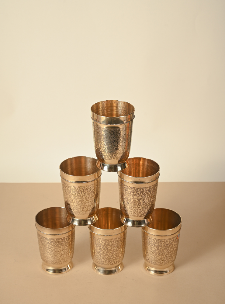 This set of handcrafted Brass Glasses features intricate hand-etched designs that add elegance and character to your tableware. Available in sets of 2, 4, or 6 and multiple sizes, each glass is made with premium quality brass, perfect for daily use or special gatherings.
