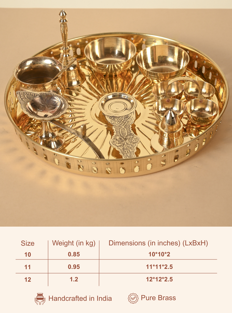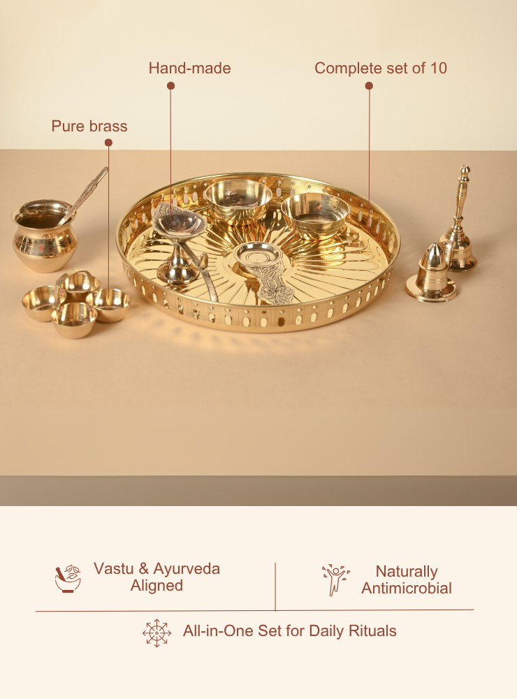 Home Sets and Combos Brass Pooja Set | Thali, Bowls, Aarti, Diya, Agarbatti Holder, Kapoor Diya, Bell, Lota, Spoon | Pooja Essentials Kit