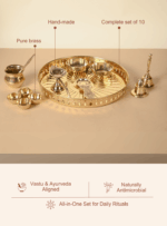 This all-in-one Brass Pooja Set includes a thali, prasad bowls, lota, spoon, chodkda, diya, aarti, and bell—everything needed for a complete ritual setup. Beautifully crafted and available in multiple sizes, it brings tradition and convenience together for daily prayers or festive worship.