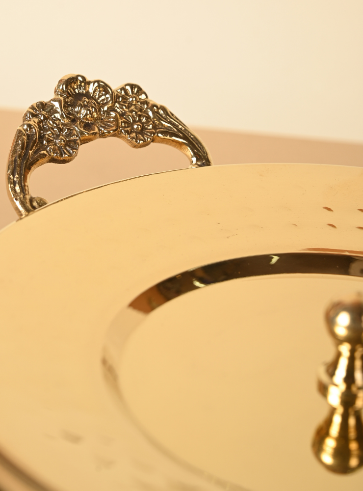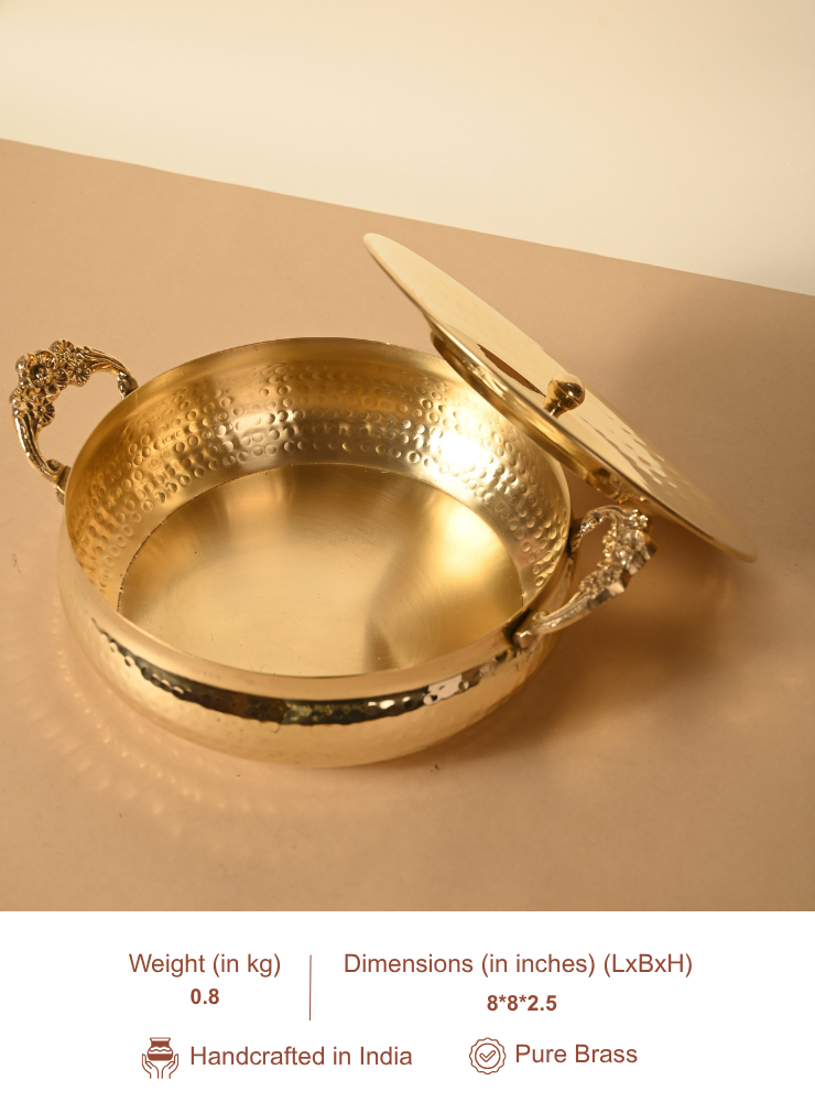 Add timeless elegance to your table with Pitaka’s Brass Serving Bowl, thoughtfully handcrafted and finished with a hammered texture for visual richness. Designed for both everyday and festive occasions, this bowl comes with a snug-fitting lid and ornate knob, making it ideal for serving warm desserts, dry snacks, or festive delicacies while keeping them fresh and covered.