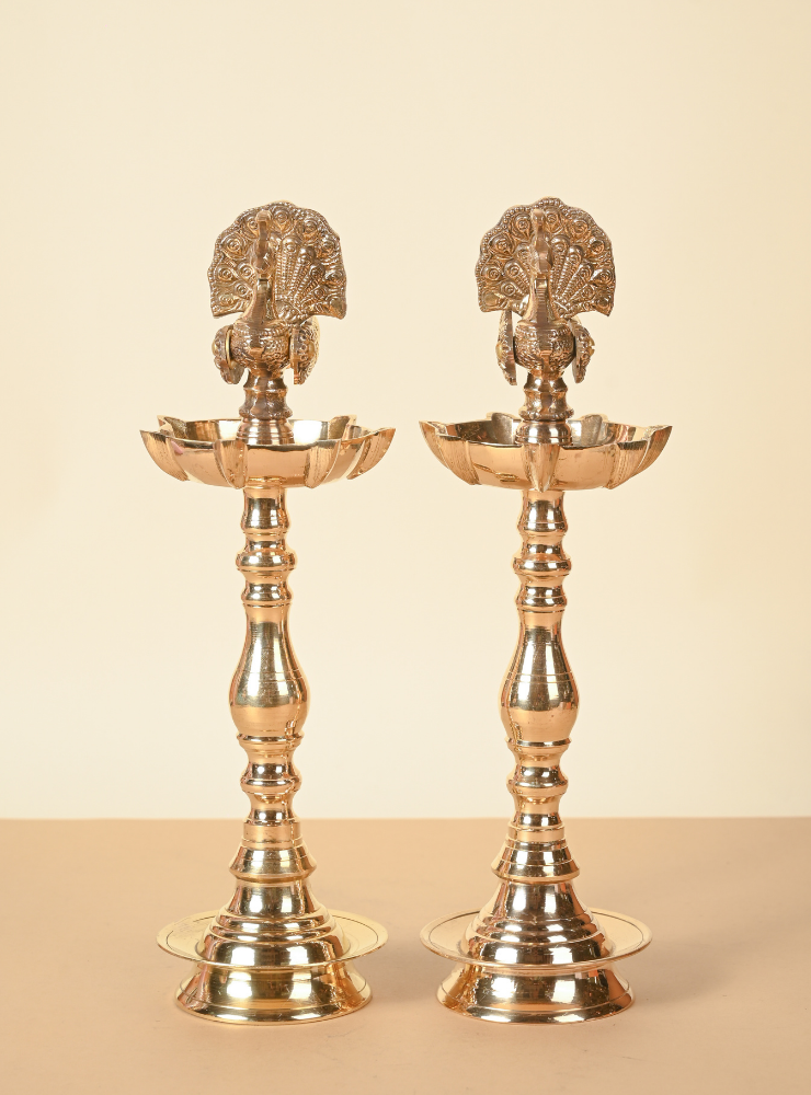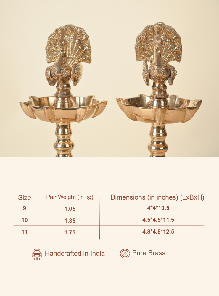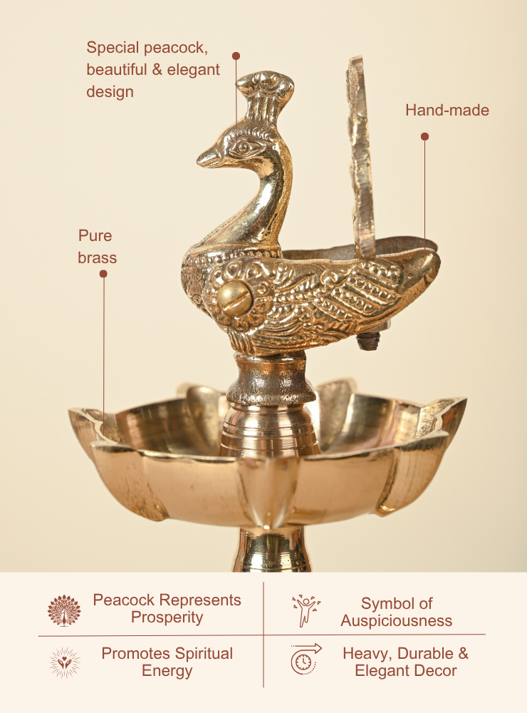 This exquisite Brass Peacock Samai stands out with its beautifully open-feathered peacock design, unlike traditional versions. With intricate carvings and fine detailing, it brings unmatched elegance and divinity to any space, and is available in multiple sizes to suit every setting.