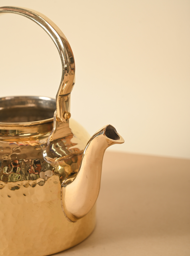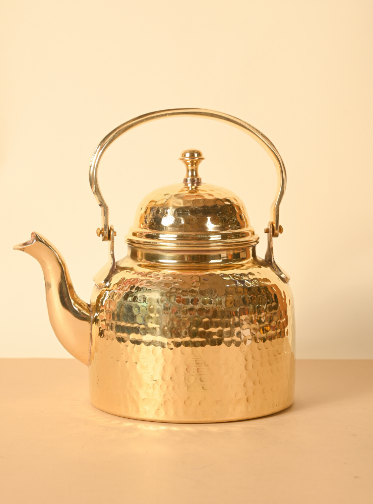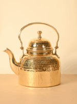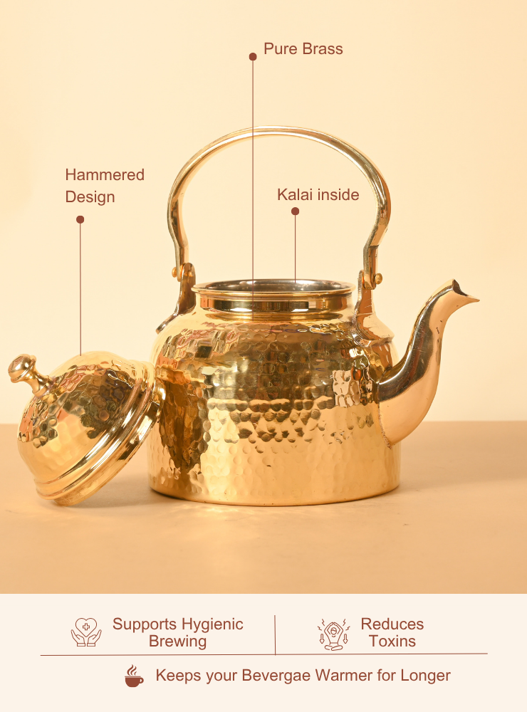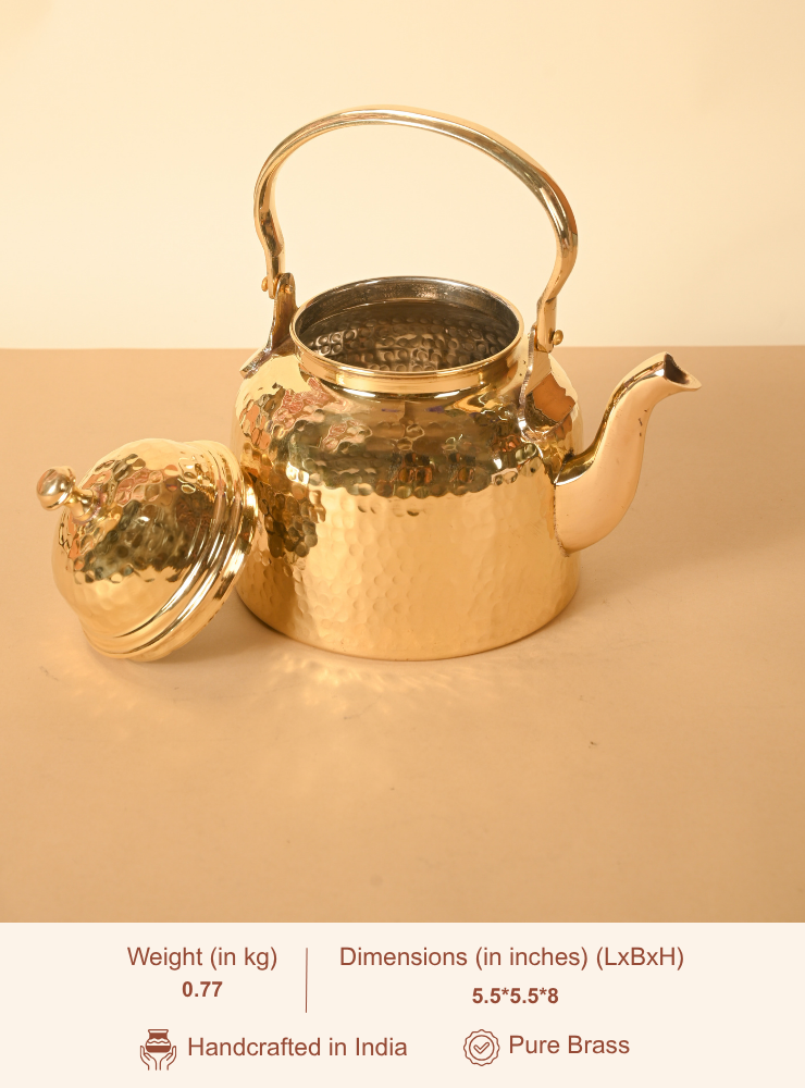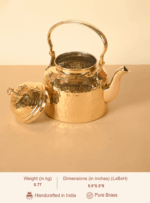 The ergonomically designed brass handle ensures a firm and comfortable grip, while the interior is lined with traditional kalai (tin coating), preserving the purity and flavor of your tea. Whether placed on your kitchen counter or brought out during special gatherings, this kettle stands as a graceful blend of utility and art.
