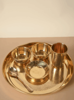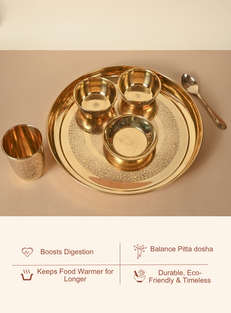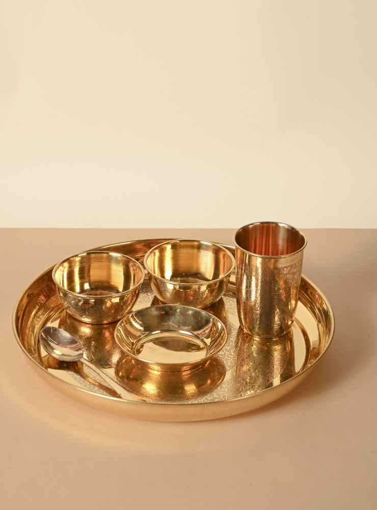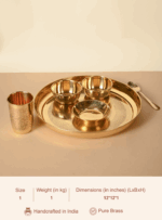 The etched patterns not only enhance the aesthetic appeal but also connect you to a rich cultural past where meals were served with care, devotion, and pride. Brass, known for its health-enhancing properties, makes this thali set not just a visual delight but also a wellness-driven choice.