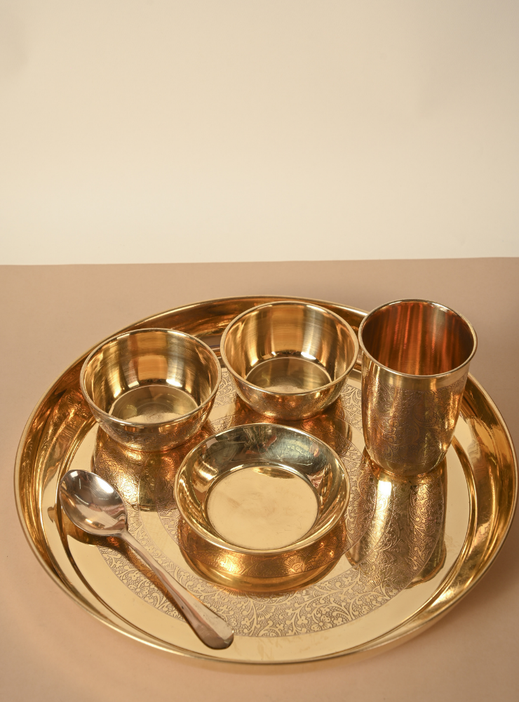 Brass Thali Set | Etching Thali Set | 1 plate 2 bowls 1 dessert plate 1 glass 1 spoon