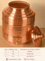This handcrafted Copper Capsule Matka features a unique capsule-shaped top with a rounded base, offering a sleek and elegant design for storing water. Its hammered finish and lacquer coating ensure it’s both visually striking and easy to clean, making it a perfect blend of tradition and modern utility.