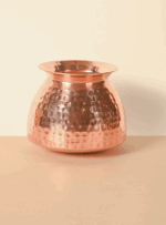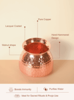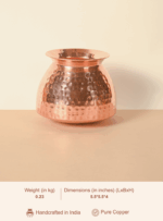 Made from pure, high-quality copper, it naturally purifies water by eliminating harmful microbes and enriching it with trace minerals known to boost immunity, aid digestion, and support overall wellness. Its sculptural form and lustrous finish make it a beautiful addition to any pooja space, dining setting, or wellness corner.