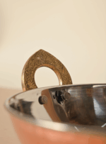 Unlike traditional cookware, the stainless steel interior offers durability and ease of maintenance, while the hammered copper outer layer ensures excellent heat conductivity and a touch of regal charm to your table. The ergonomic brass handles stay cool, providing safe handling while enhancing its traditional appeal.
