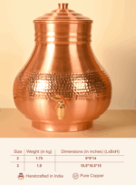 This handcrafted Copper Surahi Matka features an elegant modak-shaped design that adds a traditional yet luxurious touch to your space. With a hammered exterior and a lacquer coating for easy maintenance, it’s both functional and visually captivating for everyday use.