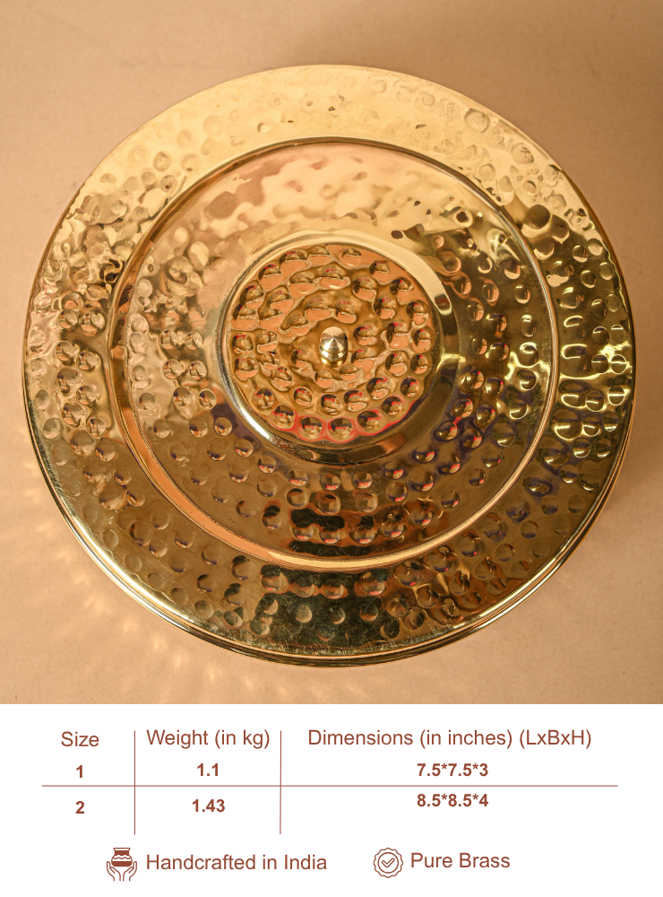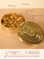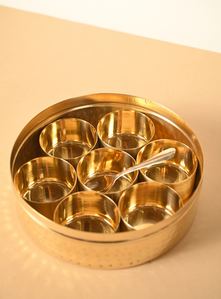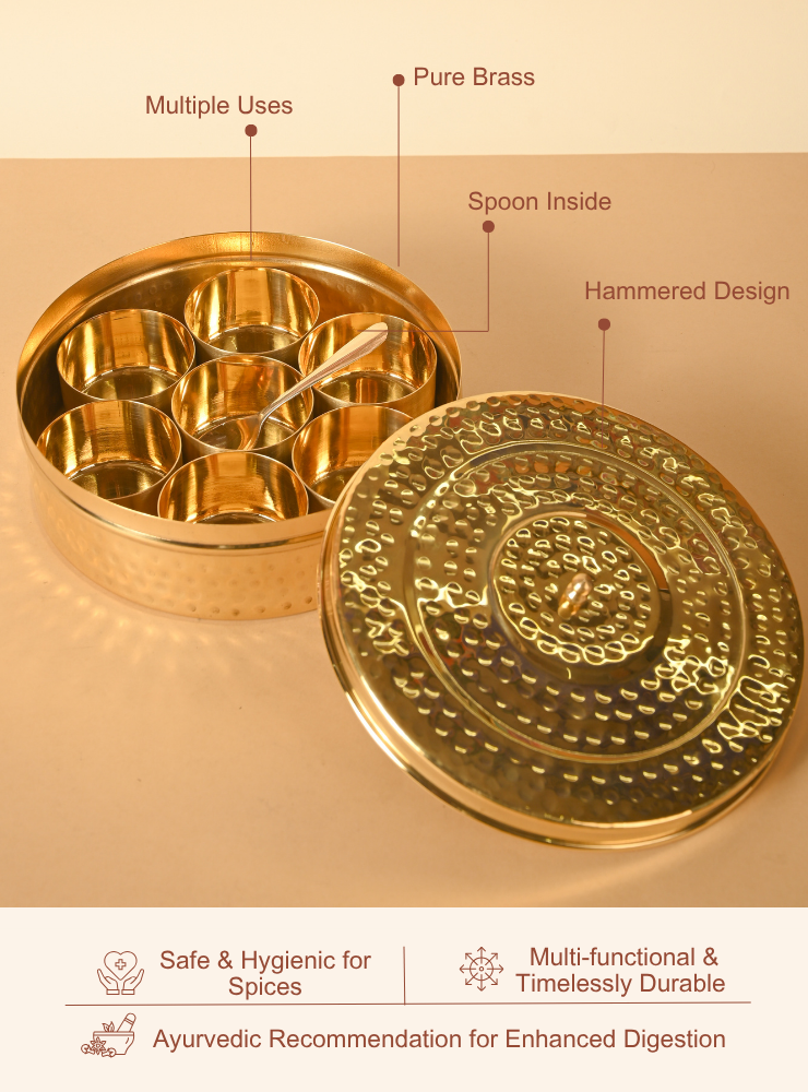 With multiple inner compartments for everyday spices, this dabba offers organized access and elevates your culinary routine. Brass naturally helps preserve the aroma and quality of spices, making this not just a container, but a trusted partner in your kitchen for years to come.