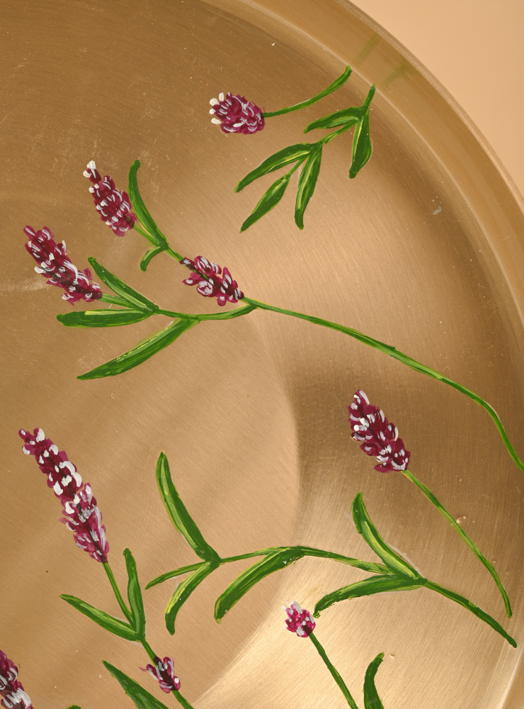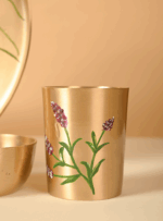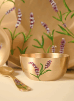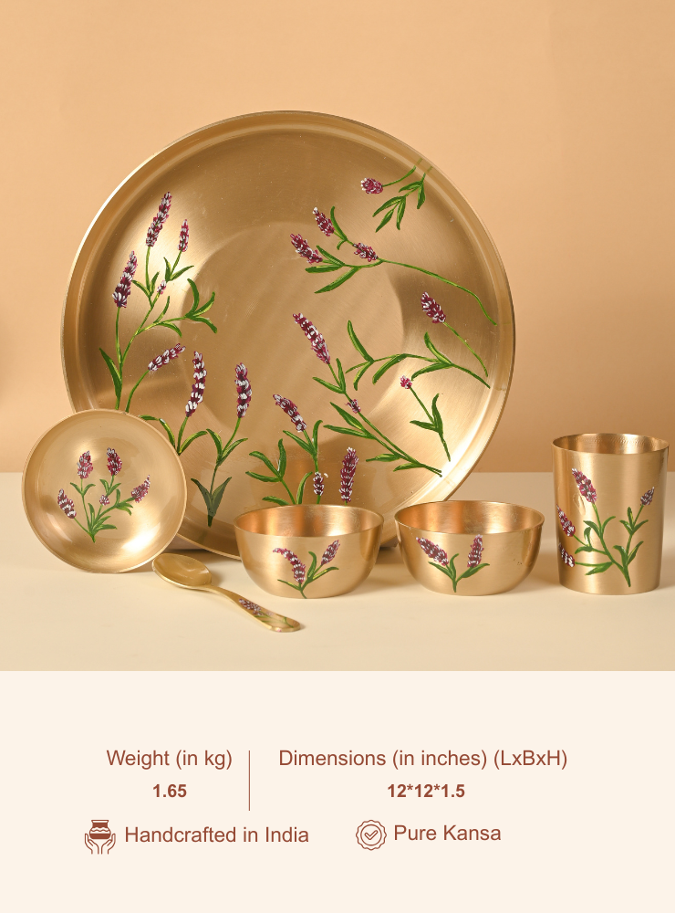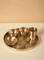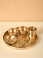 This 6-piece pure Kansa Thali Set includes a plate, two bowls, one dessert bowl, a spoon, and a glass—making it perfect for a complete traditional meal. Each piece features exquisite hand-painted detailing that can be customised to your preference. If you have a design in mind, we can personalise the paintwork—just reach out to us via email or WhatsApp.
