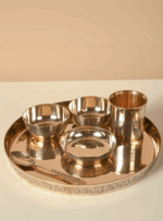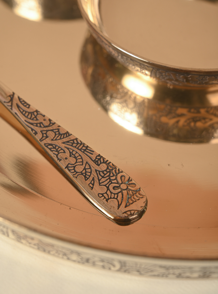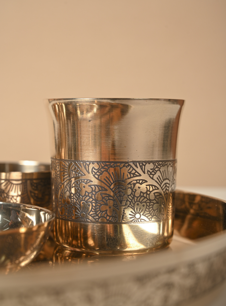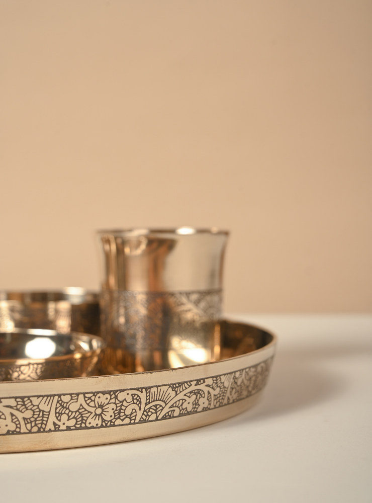Brass Thali Set | Etching Thali Set | 1 plate 2 bowls 1 dessert plate 1 glass 1 spoon