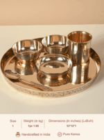 Bring back the healing wisdom of ancient Indian dining with Pitaka’s Kansa Etching Thali Set, a 6-piece thali set designed to elevate both your meal and your well-being. Made from authentic Kansa (bell metal) and adorned with delicate etching work, this set includes: 1 large thali (plate), 2 bowls (katoris), 1 dessert plate, 1 glass, and 1 spoon.