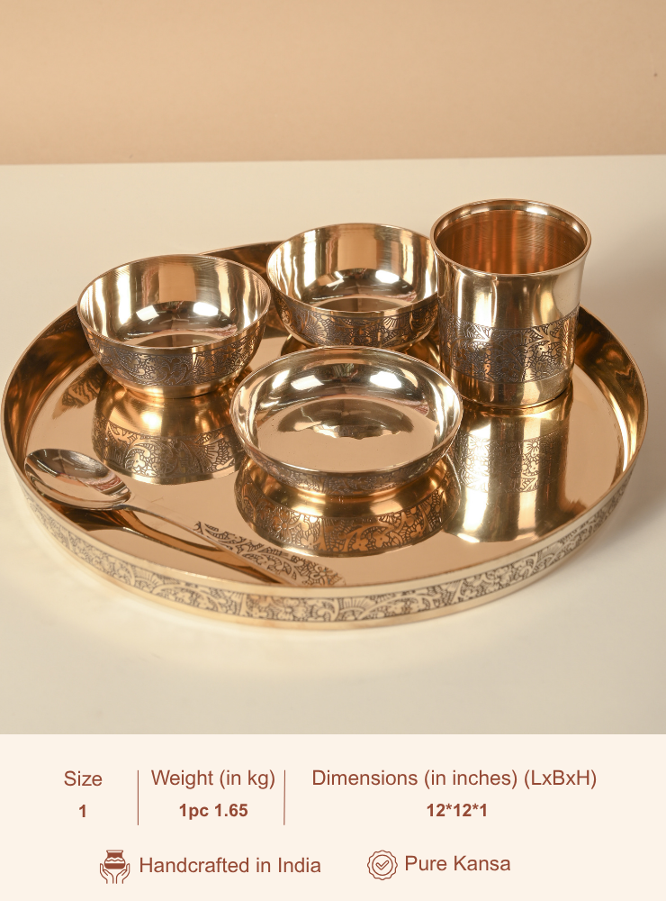 Home Tableware and Dinnerware Kansa Thali Set | Etching Thali Set | | 1 plate 2 bowls 1 dessert plate 1 glass 1 spoon
